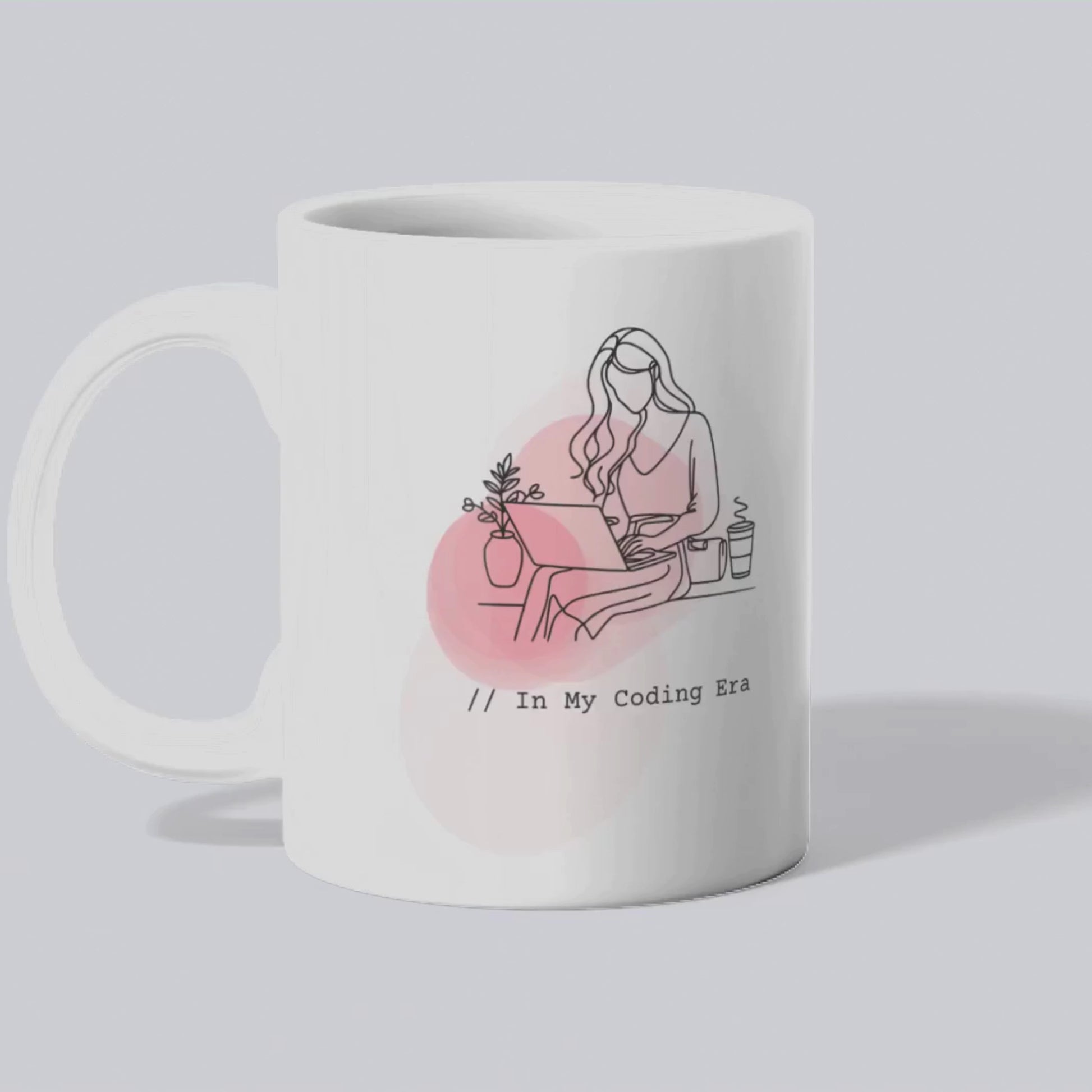 A ceramic mug featuring a woman coding with the text 'In my Coding Era'. Perfect for tech-savvy individuals who enjoy a cup of coffee or tea while working on their coding projects. Ideal for programmers, software engineers, and computer science students. Great gift for National Technology Day, National Programmers Day, or as a birthday present for a coder friend.