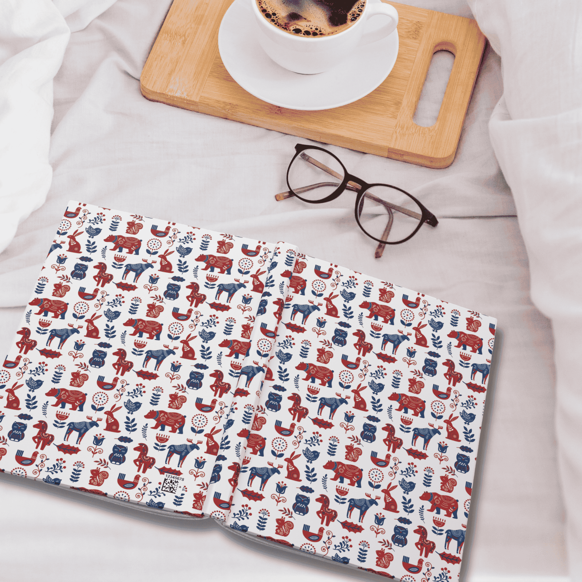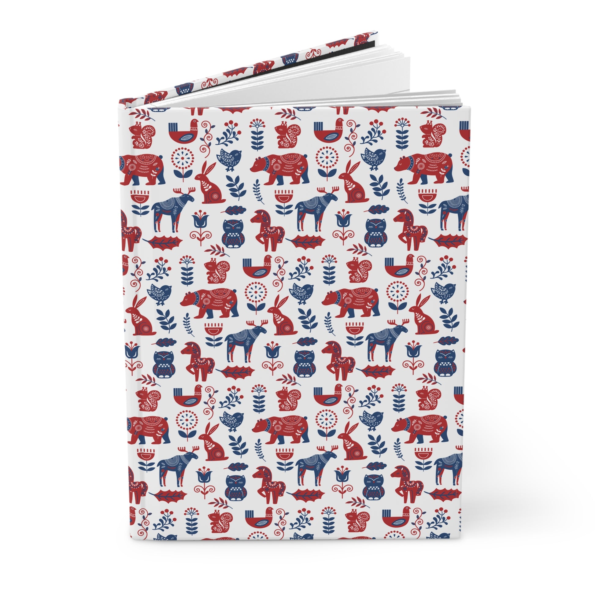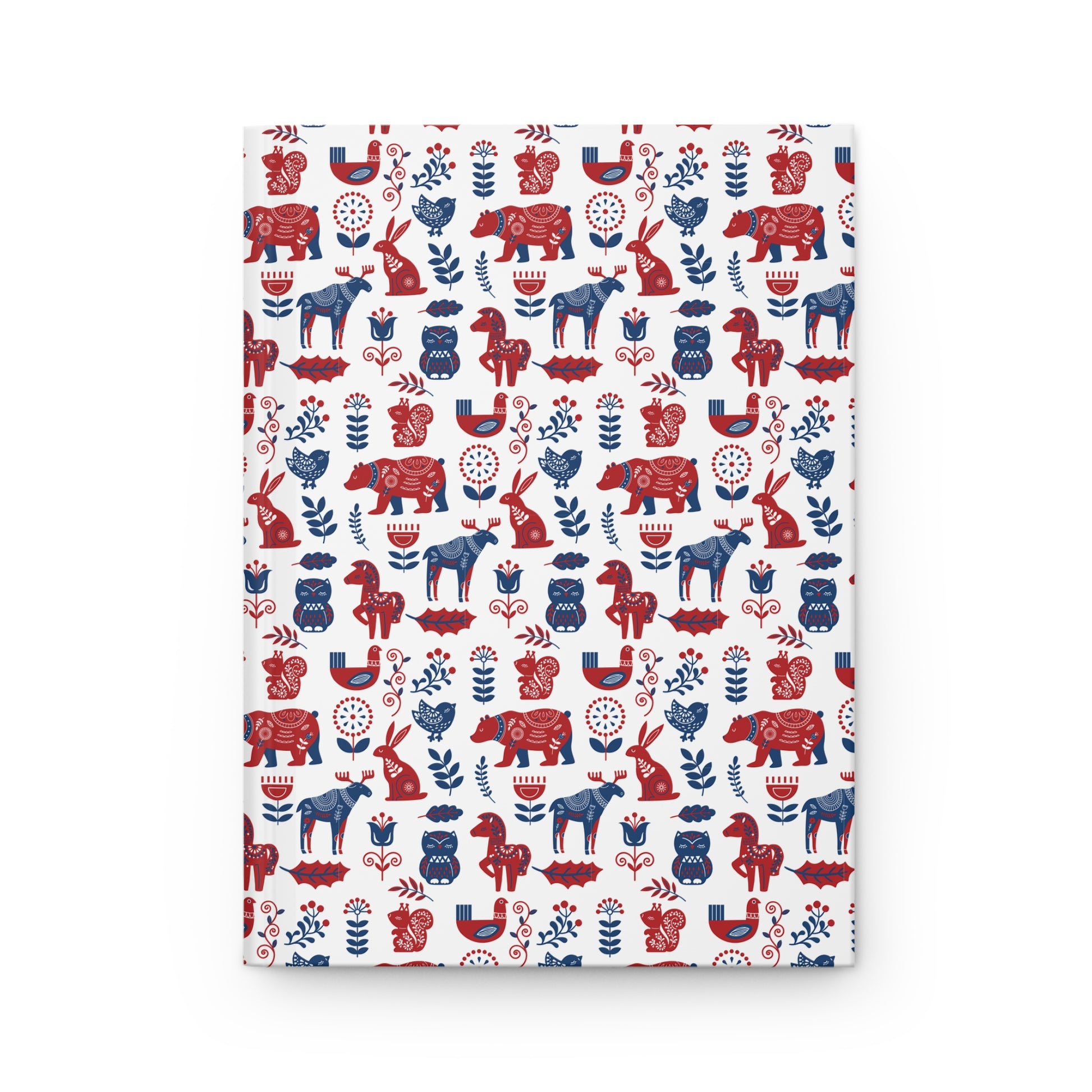 Hardcover Diary Journal featuring a Scandinavian Folk Art Animal Pattern design, perfect as a Christmas gift. The matte laminated cover provides durability, vibrant colors make the design pop, and perforated pages allow for easy tearing. The journal's casewrap binding ensures flexibility and the full wraparound print adds a stylish touch.