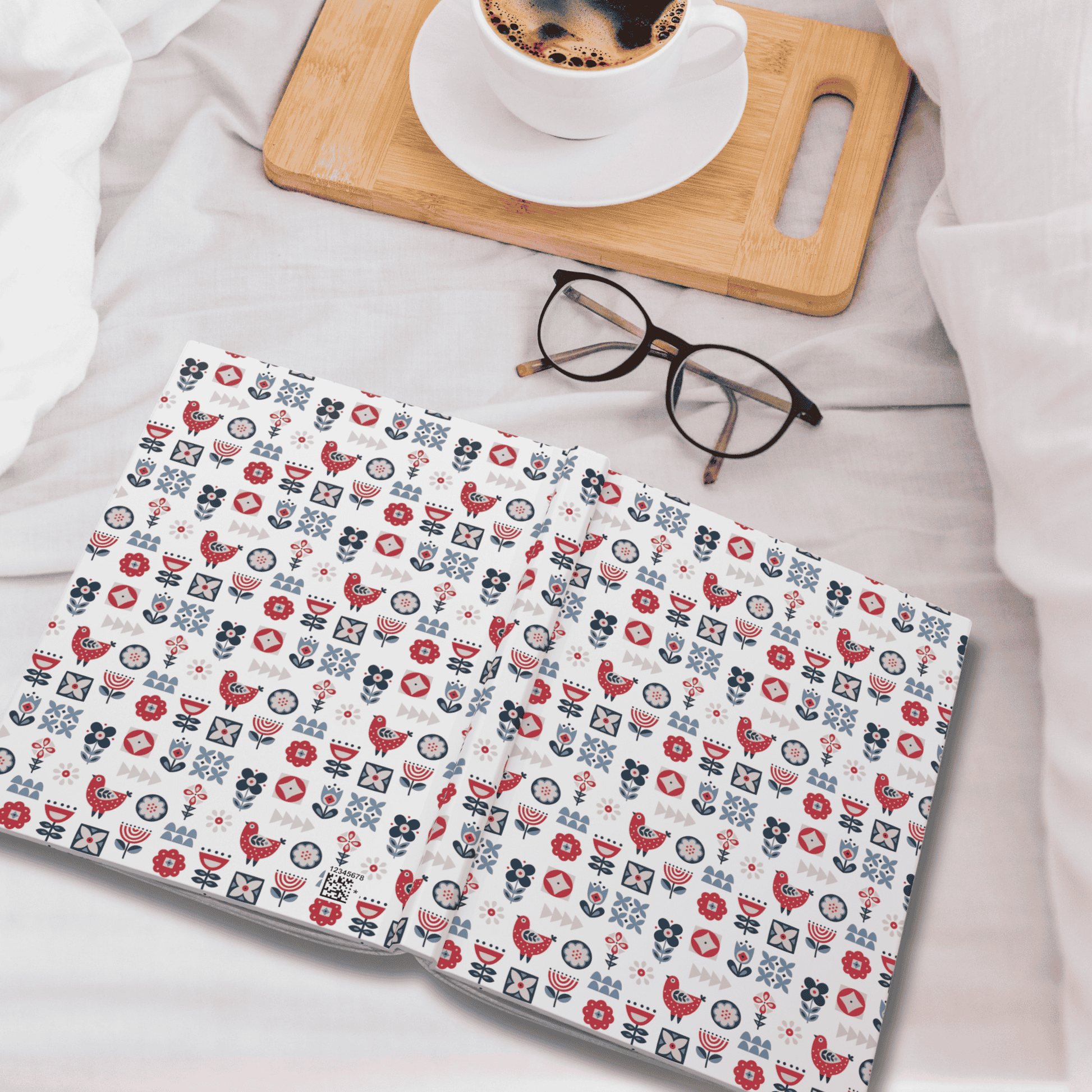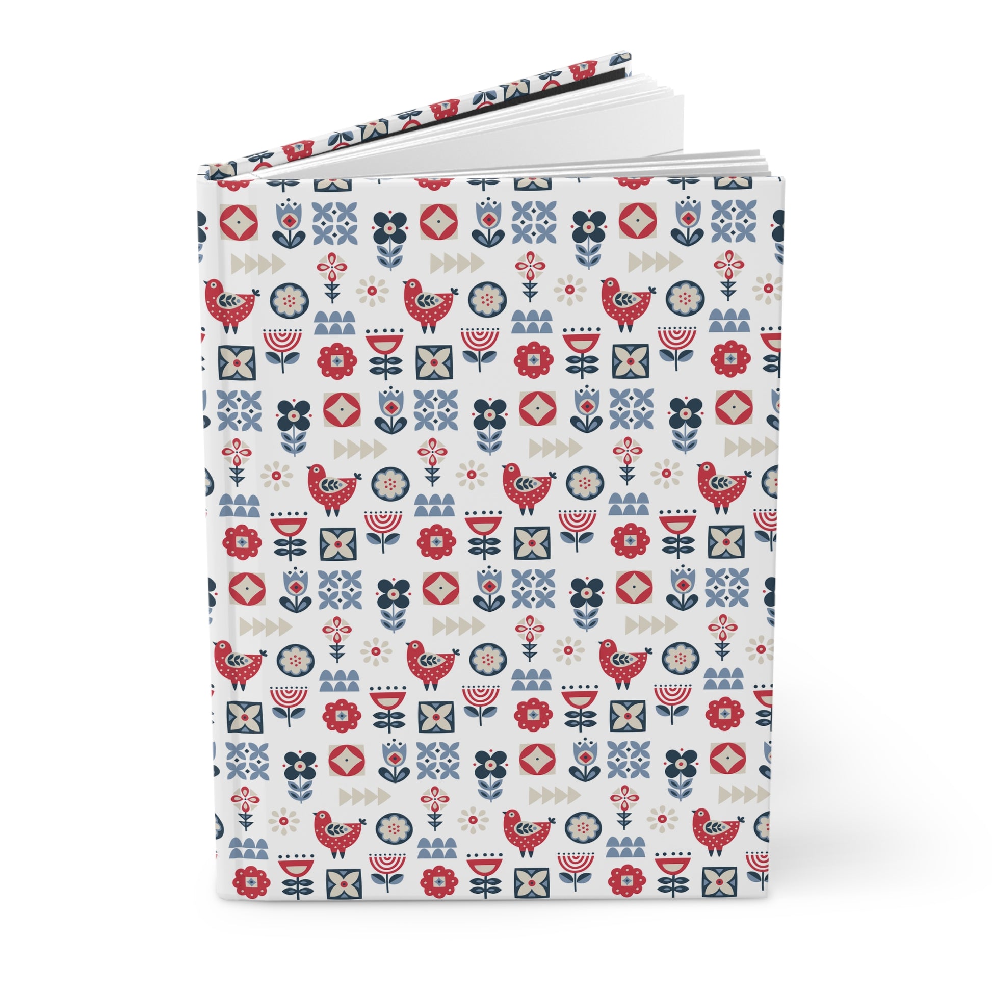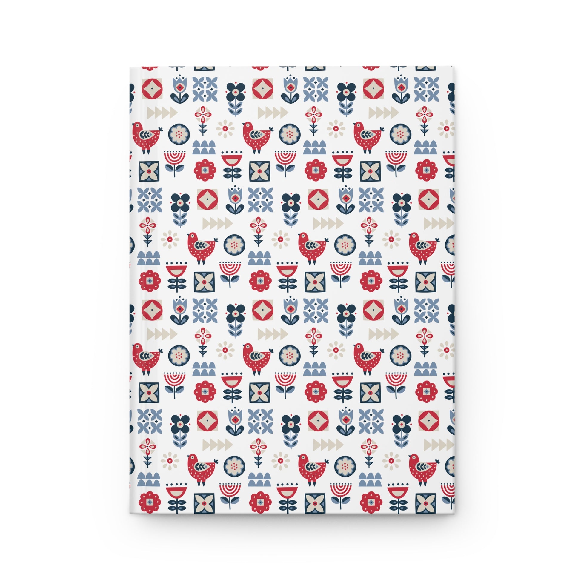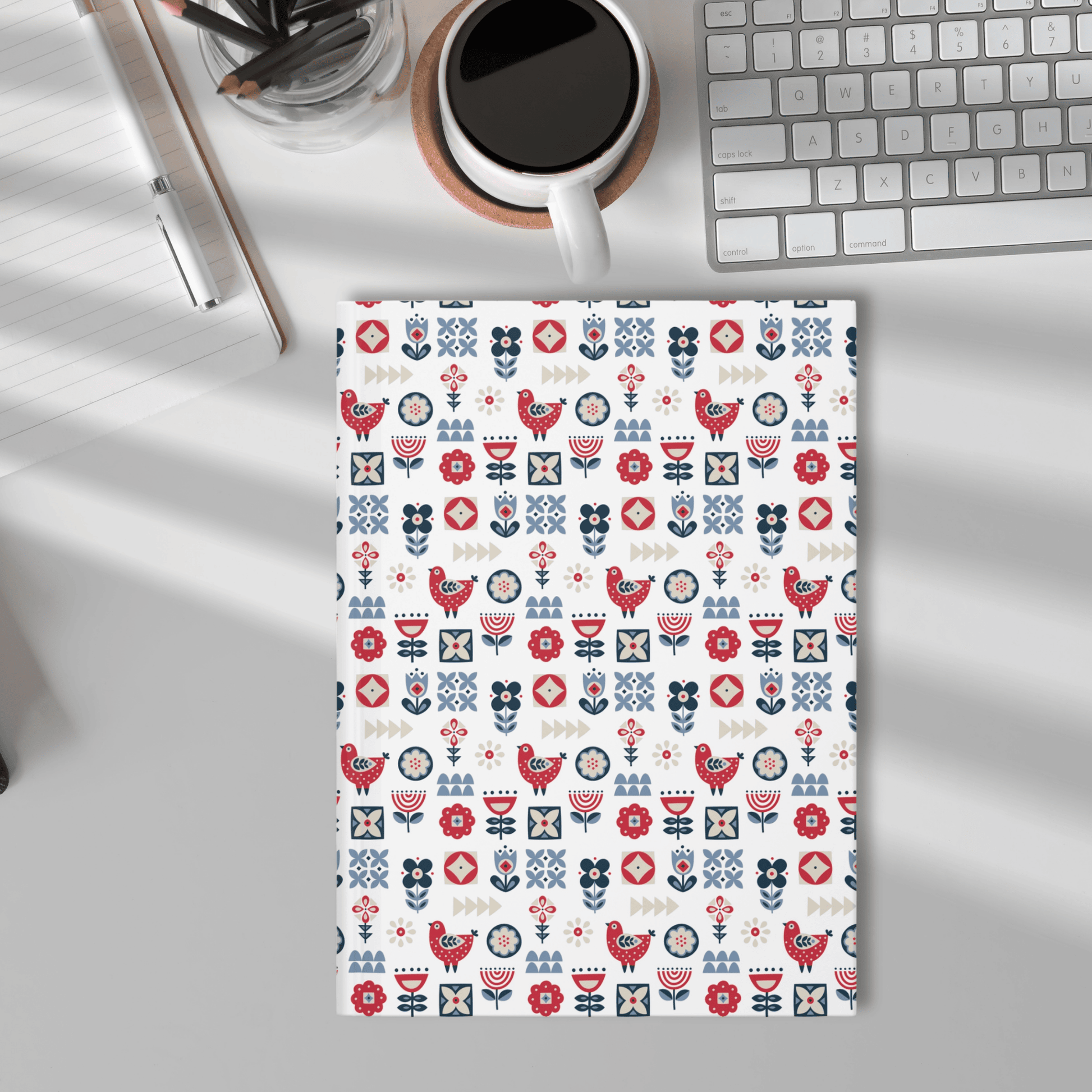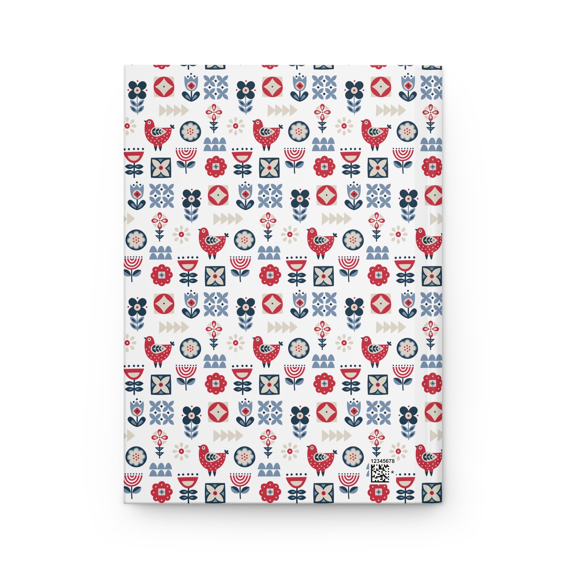 Nature-inspired Scandinavian folk art animal pattern journal with a blue and yellow color scheme. The matte laminated cover provides durability, while the vibrant colors and lined pages allow for creative writing and doodling. Perfect for nature lovers, artists, and those who appreciate unique design. Ideal for gifting during birthdays, holidays, and special occasions.
