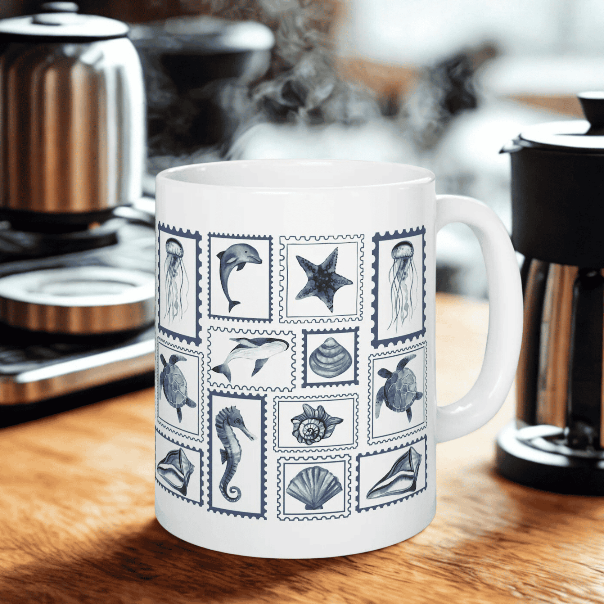 Nautical Ceramic Mug, 11oz and 15oz, Stamp Design Ocean-Themed Drinkware, Sea Life Coffee Cup, Coastal Decor, Ideal Gift for Marine Lovers